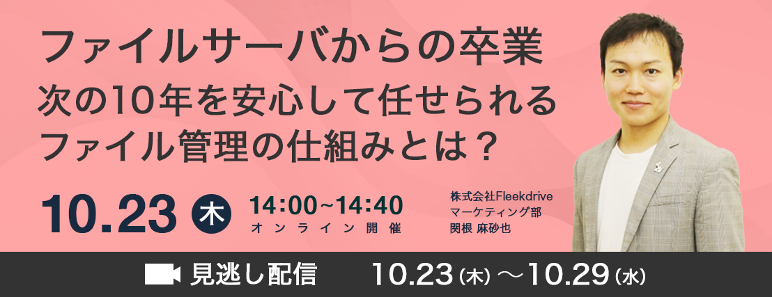 14:00~14:40 | ファイルサーバからの卒業 次の10年を安心して任せられるファイル管理の仕組みとは? 株式会社Fleekdrive マーケティング部 関根 麻砂也 |