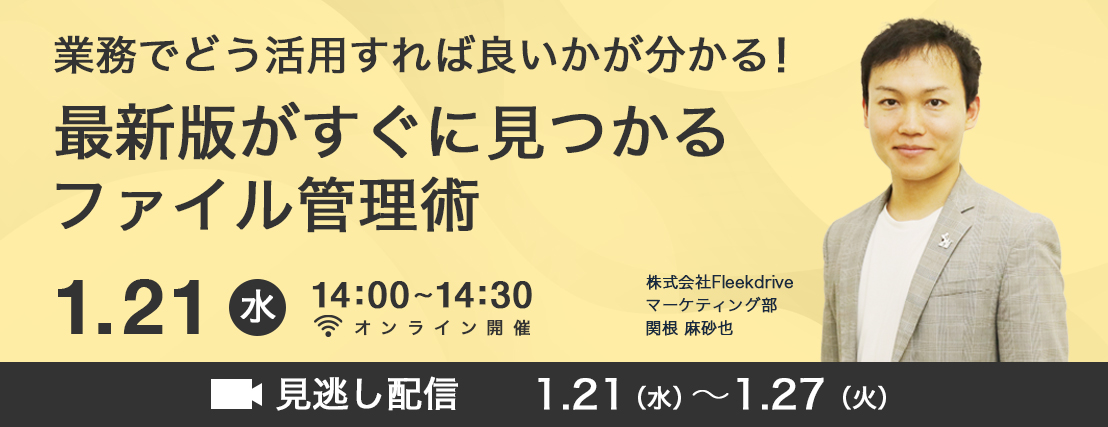 | 14:00~14:30 | 業務でどう活用すれば良いかが分かる!最新版がすぐに見つかるファイル管理術 株式会社Fleekdrive マーケティング部 関根 麻砂也 |