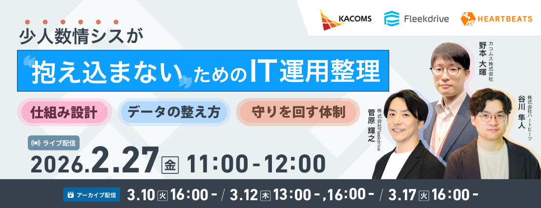 | プログラム詳細 | ◾️オープニング「なぜ情シスは“迷う状態”に陥るのか?」 ◾️各社セッション 「人のミスを前提にしたセキュリティ設計~少人数情シスが迷わない環境・仕組みづくり~」 L カコムス株式会社 「事故を生まない“情報の置き場”の作り方 〜少人数情シスのための利用管理の考え方〜」 L 株式会社Fleekdrive 「少人数でも成立する運用・検知・対応体制 〜すべてを自社で抱えない選択〜」 L 株式会社ハートビーツ ◾️クロージング |