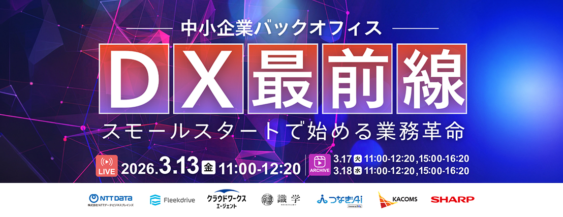 | プログラム詳細 | ■オープニング ・中小企業DXは“全部導入型”では失敗する ・重要なのは順番 ・土台から段階的に進めること ■各社登壇 ・株式会社Fleekdrive「ファイル起点で始めるDX 業務効率化につながる情報共有」 ・シャープマーケティングジャパン株式会社「紙から電子化へ。業務効率化の第一歩」 ・カコムス株式会社「二重入力を終わらせる。データ連携で始める業務効率化」 ・株式会社NTTデータビジネスブレインズ「変えられない基幹システム。その周辺をつなぐ“現実的なデータ基盤”という選択肢」 ・日本電子計算株式会社「整った基盤にAIを活かす。スモールスタートで始めるAI業務改革」 ・株式会社クラウドワークス「自社だけで頑張らないDX。外部リソース活用という現実解」 ・株式会社識学「DXが進まない本当の理由。実行される組織のつくり方」 ■質疑応答、クロージング |