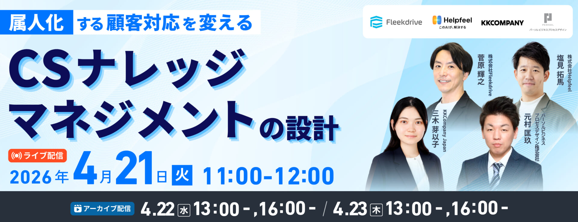 | プログラム詳細 | ◾️オープニング/イントロダクション 「なぜ顧客対応は属人化するのか? CSナレッジマネジメントの全体設計」 ◾️各社セッション ・【顧客自己解決】 株式会社Helpfeel 「本当に見つかるFAQ」を創り出す|AI×人のナレッジ整備 」 ・【有人対応】 パーソルビジネスプロセスデザイン株式会社 「対応品質を高めるコンタクトセンター運営とナレッジ活用」 ・【社内ナレッジ共有】 株式会社Fleekdrive 「分散した情報を整理する社内ナレッジ共有基盤の作り方」 ・【教育・標準化】 KKCompany Japan 「顧客対応の属人化を脱却! 動画活用で成果が出るCS教育の新常識」 ◾️クロージング |