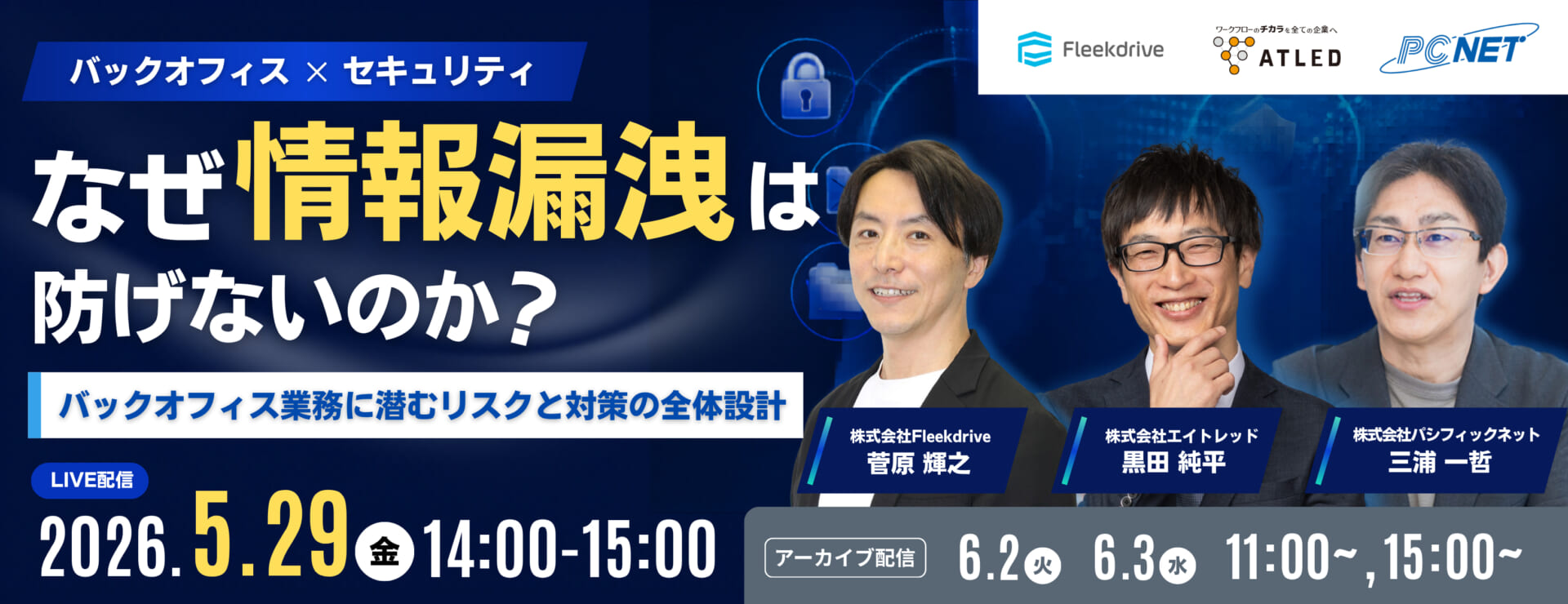 | プログラム詳細 | ◾️オープニング・イントロダクション 「情報漏洩は“単発のミス”ではなく、“業務全体の構造”で起きている」 ◾️各社セッション 「情報漏洩を防ぐ第一歩は“基盤”から〜分散をなくすファイル管理の最適解〜」 株式会社Fleekdrive 「なぜ承認プロセスの不備が情報漏洩を招くのか?〜業務フローから見直す内部統制のポイント〜」 株式会社エイトレッド 「なぜ“最後の工程”で情報漏洩は起きるのか?〜IT資産の処分に潜むリスクとは〜」 株式会社パシフィックネット ◾️クロージング |